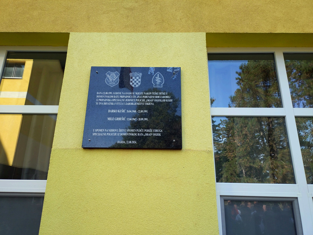 Dana 22.08. 1991. godine na ovom mjestu ( osnovna škola Darda) nakon teške bitke u Domovinskom ratu pripadnici tzv. jna (namjerno malim slovima) i pobunjeni srbi zarobili 12- pripadnika SPECIJALNE POLICIJE – ORAO -.OSIJEK , od kojih su dva HRVATSKA VITEZA u zarobljeništvu ubijena.